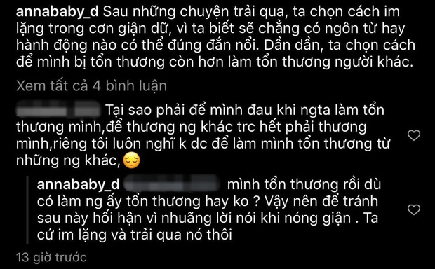 Theo đó, Trang Anna cho biết hiện tại cô "lựa chọn cách im lặng trong cơn giận dữ" và "để mình bị tổn thương còn hơn làm tổn thương người khác". Dù chỉ là status đi mượn của người khác nhưng có thể nói quan điểm này của Trang hoàn toàn khác với cách xử lý trong lùm xùm với Trần Nghĩa trước đây.
