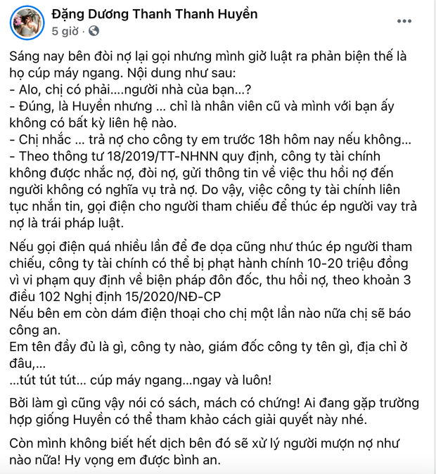 Sau chuỗi ngày nhẫn nhịn, lần này Thanh Thanh Huyền quyết định đem luôn cả luật ra để nói chuyện khi nhân viên thu hồi nợ mới chỉ kịp đe dọa "nếu không…". Ngoài ra cô nàng cũng nói thẳng nếu bên đòi nợ còn định gọi thêm lần nữa, cô sẽ để công an giải quyết đồng thời hỏi rõ tên tuổi, nơi làm việc của nhân viên đang gọi cho mình. Trước phản ứng "căng cực" của gái xinh, bên đòi nợ tắt máy ngang.