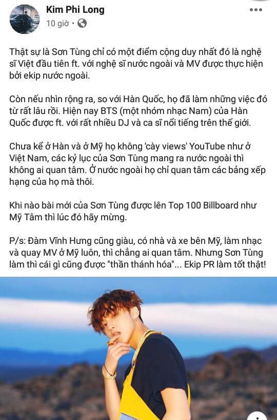 - Dù không biết tên Kim Phi Long là ai mà cũng chả phải fan Sơn Tùng nhưng thật sự cũng phải nể những gì Tùng làm được. Nếu không thưởng thức được mình giữ trật tự cho người ta thưởng thức, đàn ông đàn ang nói nhiều thường chẳng phải điềm tốt.