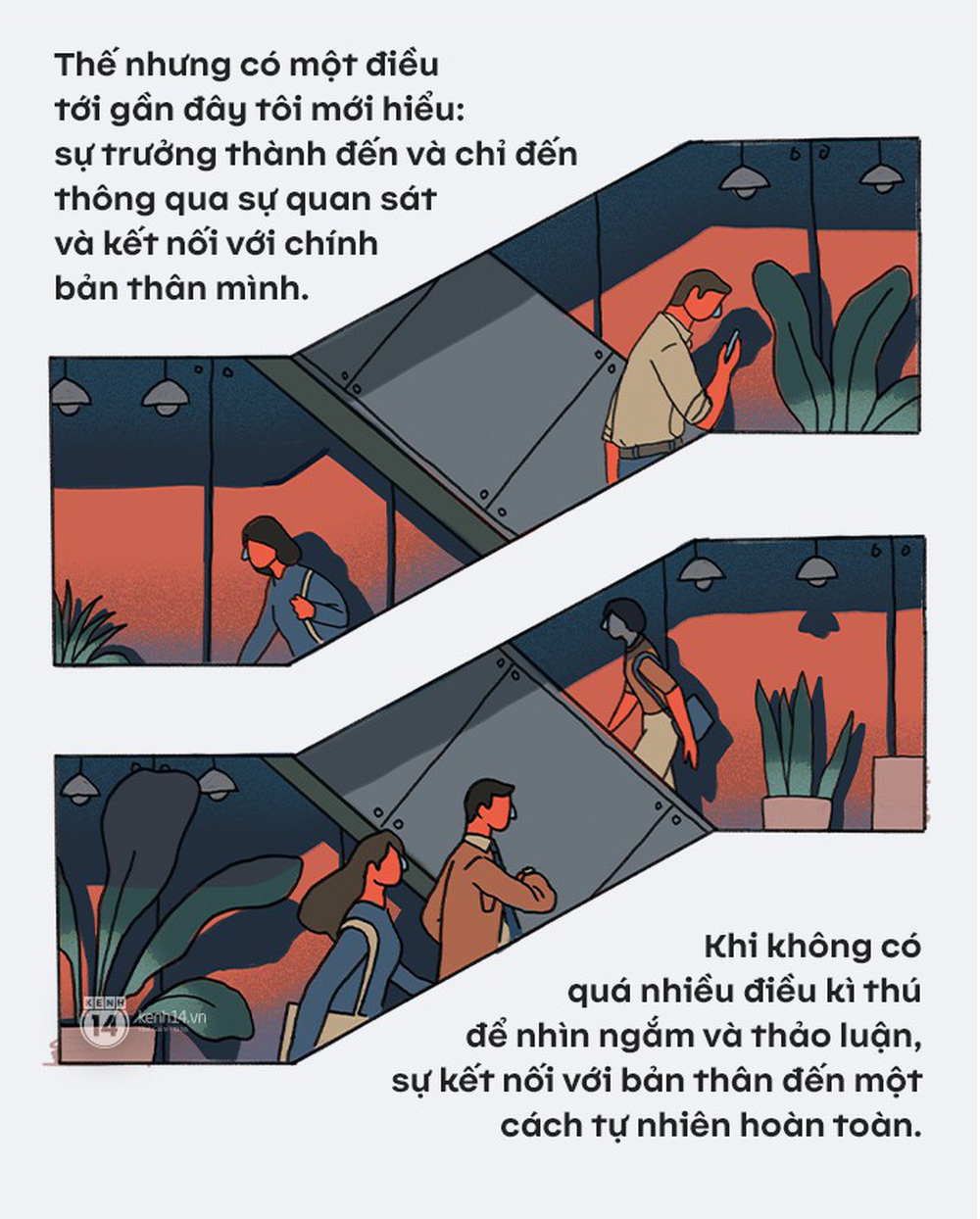 Thế nhưng có một điều tới gần đây tôi mới hiểu: sự trưởng thành đến và chỉ đến thông qua sự quan sát và kết nối với chính bản thân mình. Khi không có quá nhiều điều kì thú để nhìn ngắm và thảo luận, sự kết nối với bản thân đến một cách tự nhiên hoàn toàn. Thế nhưng trong một thế giới mới luôn có một điều gì đó giật gân hơn, mới mẻ hơn, thì sự kết nối này lại bị trì hoãn vô thời hạn. Đặc biệt là khi không có ai đi trước để nói cho bạn biết rằng bạn phải tắt điện thoại đi, và đối diện với những vấn đề của chính bản thân mình trước khi quá muộn.