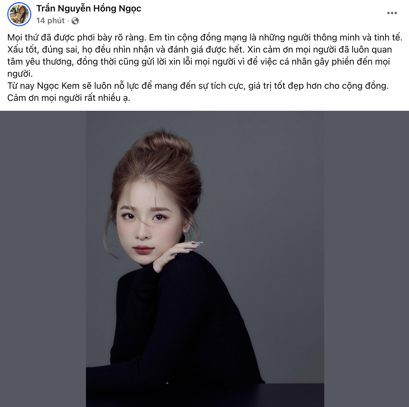 Từ nay Ngọc Kem sẽ luôn nỗ lực để mang đến sự tích cực, giá trị tốt đẹp hơn cho cộng đồng. Cảm ơn mọi người rất nhiều ạ".