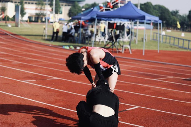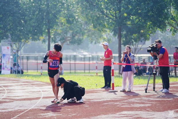 Ngay khi cán đích Trung Cường đã nhận được sự động viên từ vợ là Vũ Ngọc Ánh. Vợ của chân chạy 3000m chướng ngại vật lập tức đến tháo giầy giúp chồng thoải mái và đỡ chồng ra nghỉ ngơi sau khi về nhất.