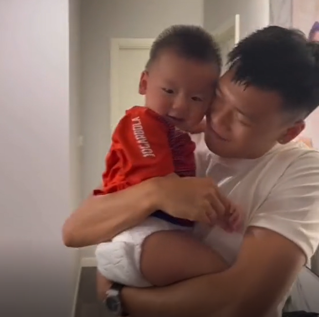 Tuy nhiên, khi về đến nhà, gặp cậu con trai đầu lòng có biệt danh Leo, Thành Chung lại khiến nhóc tỳ không nhận ra chỉ vì cặp kính râm. Chỉ đến khi cầu thủ sinh năm 1997 tháo kính ra, bé trai một tuổi mới chịu theo bố và để cho bố bế. Trung vệ tuyển Việt Nam ôm con vào lòng, hai bố con quấn quýt không rời.