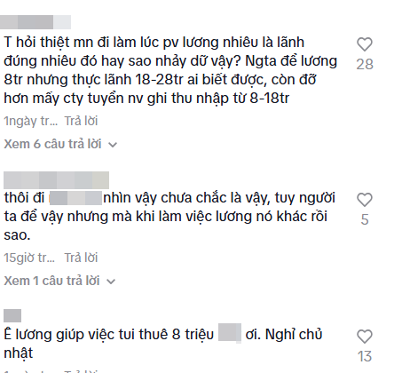 - “List công việc này mà 8 triệu mình thấy không thoả đáng lắm. Trong khi bữa đọc ở đâu lương nhân viên vệ sinh môi trường cũng đã 10 triệu đồng, mà có chia ca làm việc rõ ràng không phải fulltime”.