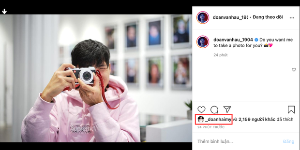 Mới đây (tối ngày 30/12), Văn Hậu đăng ảnh mặc áo hoodie hồng, tay cầm máy ảnh với dòng chia sẻ: "Do you want me to take a photo for you?" (Tạm dịch: Em có muốn anh chụp một tấm ảnh cho em không?). Ngay lập tức, người ta suy luận ngay Văn Hậu đang gửi lời đến Hải My.