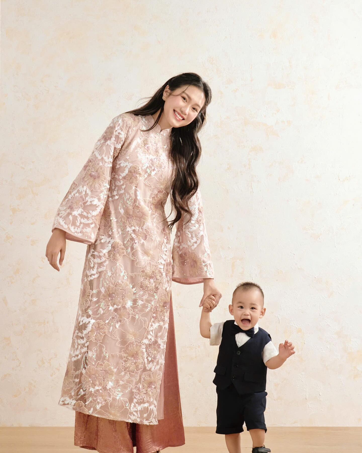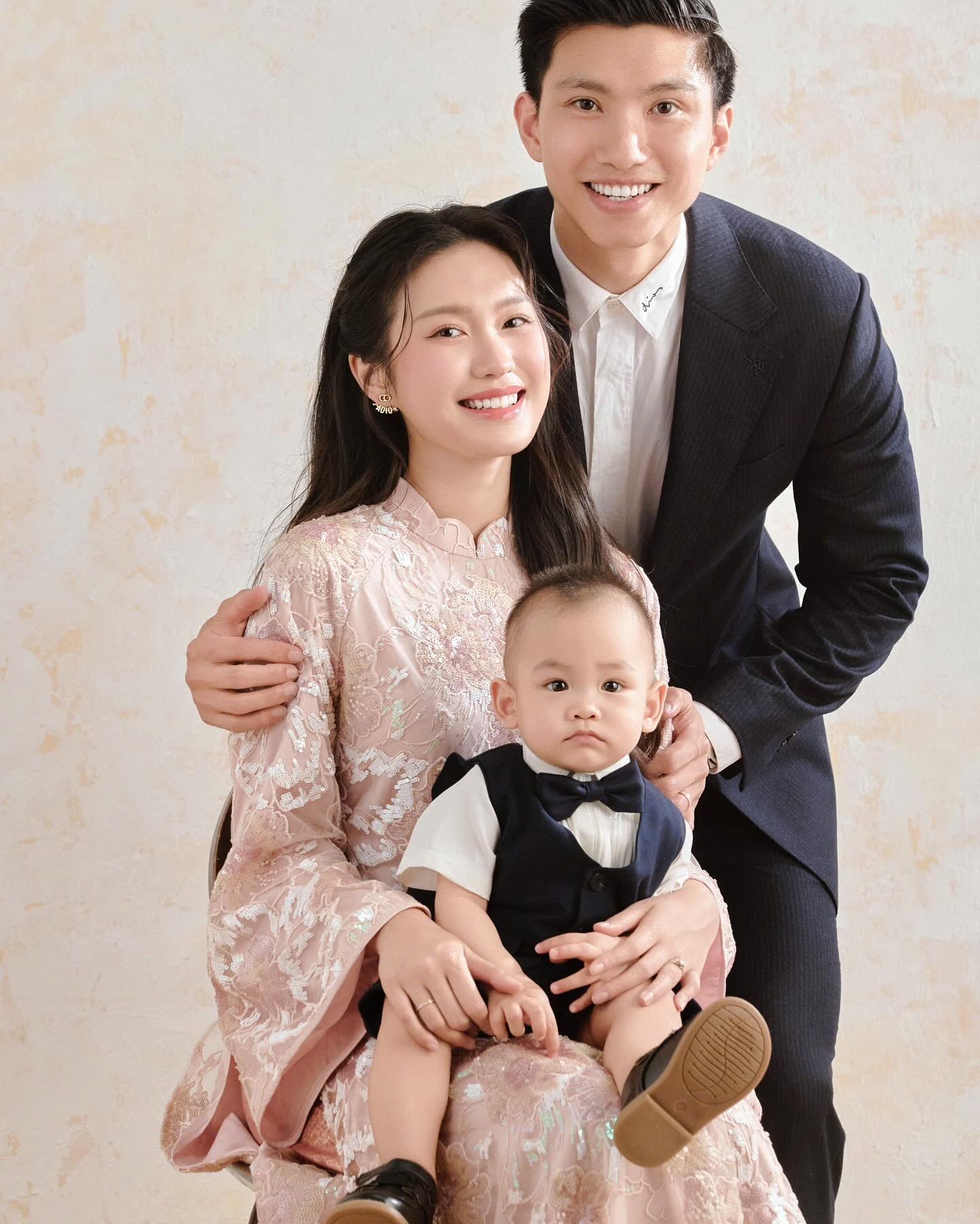 Trong một concept khác mang phong cách trang trọng và ấm áp, Đoàn Văn Hậu mặc bộ vest tối màu thanh lịch, kết hợp với áo sơ mi trắng, toát lên vẻ nam tính và tự tin, nụ cười rạng rỡ thể hiện niềm hạnh phúc khi làm cha. Doãn Hải My diện áo dài ren màu hồng pastel, với họa tiết hoa thêu tay tinh tế, tôn lên vẻ đẹp dịu dàng của tiểu thư đài các. Làn da trắng mịn, đôi mắt long lanh và nụ cười ấm áp của cô nàng gây ấn tượng mạnh. Bé Lúa, ngồi giữa cha mẹ, mặc vest nhỏ xinh với nơ bướm, đôi mắt to tròn và biểu cảm đáng yêu thu hút sự chú ý.