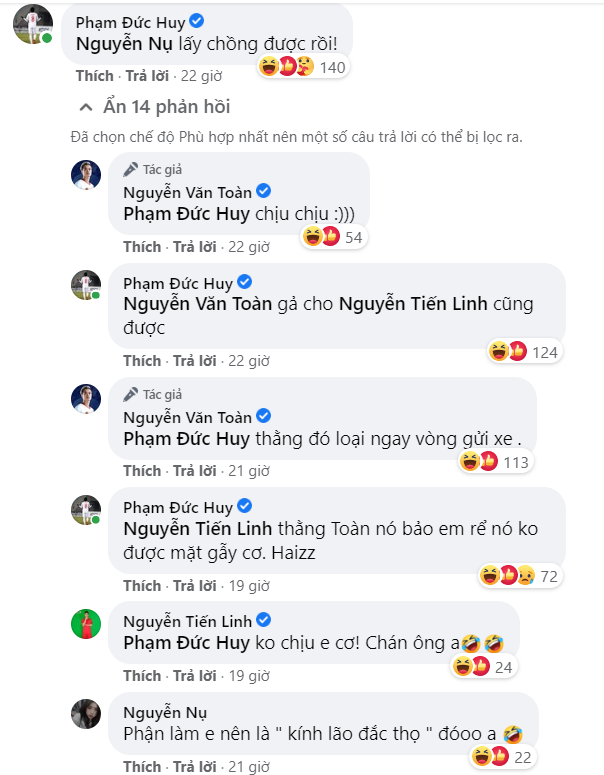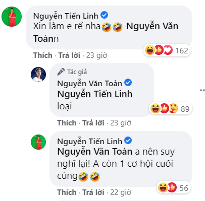 Tuy nhiên, Văn Toàn đã thẳng thừng loại người đồng nghiệp khỏi danh sách ứng cử viên làm rể. Tiến Linh cảm thán hài hước: "Không chịu em cơ, chán ông anh". Trong bài đăng của một người bạn chia sẻ hình ảnh Văn Toàn đang đếm tiền hàng, cầu thủ của Bình Dương cũng trêu chọc: "Lý do xin làm em rể Văn Toàn là đây chứ đâu".