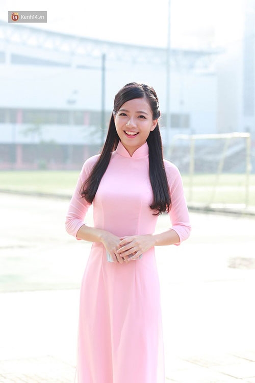 | Cô giáo Phan Hồng Anh - bóng hồng nổi tiếng của trường chuyên Hà Nội Amsterdam - xuất hiện với nụ cười rạng rỡ quen thuộc của mình. Với bộ áo dài màu hồng phấn, trông cô giáo càng thêm phần xinh đẹp, nữ tính. |