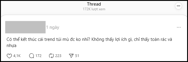 - Trend chơi túi mù linh tinh nhỏ nhỏ thải rác nhiều quá mức cần thiết rồi. Xin đừng so sánh việc này với mấy cái ly túi nhựa khác, cái gì hạn chế được thì nên hạn chế chứ.