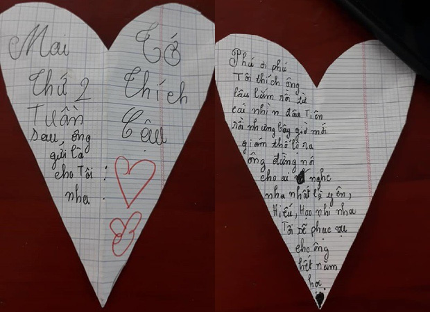 Ngoài ra còn là hai trái tim to đùng đi kèm trong thư gửi tới cậu bé tên Phú. Kết quả, cô nhóc lớp 4 đã gửi thư thành công cho bạn nam nhưng trong lúc cậu bé hí hoáy cất "thư tình" thì cô giáo phát hiện.
