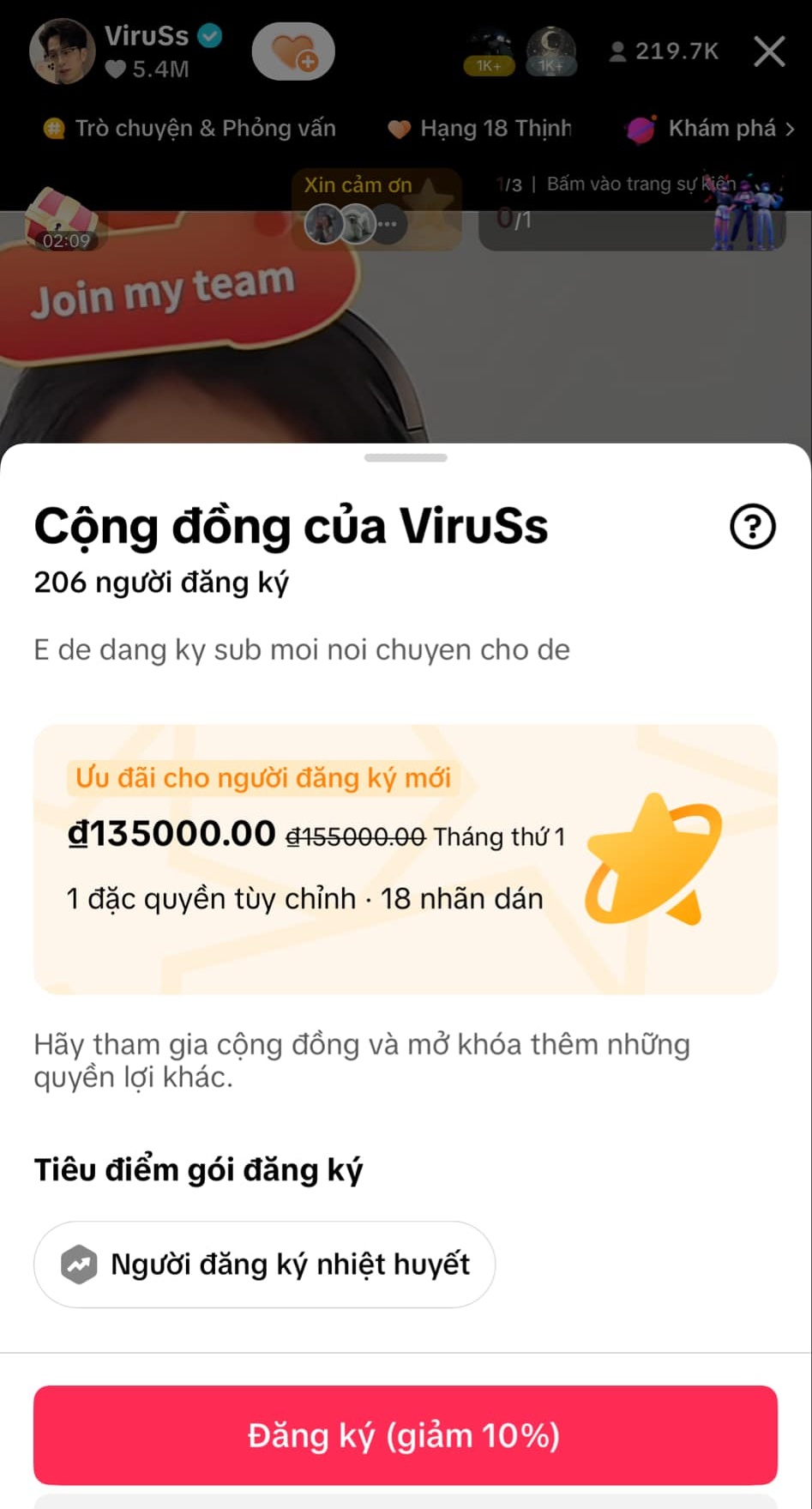 Tính đến 12h57 - sau khi ViruSs livestream diễn ra được hơn 2 tiếng, đã có 206 người đăng ký. Theo tìm hiểu, mức phí đăng ký LIVE mà nền tảng đưa ra là 155.000 VNĐ/ tháng. Hiện tại người đăng ký mới đang có ưu đãi nên còn 135.000 VNĐ/ tháng.