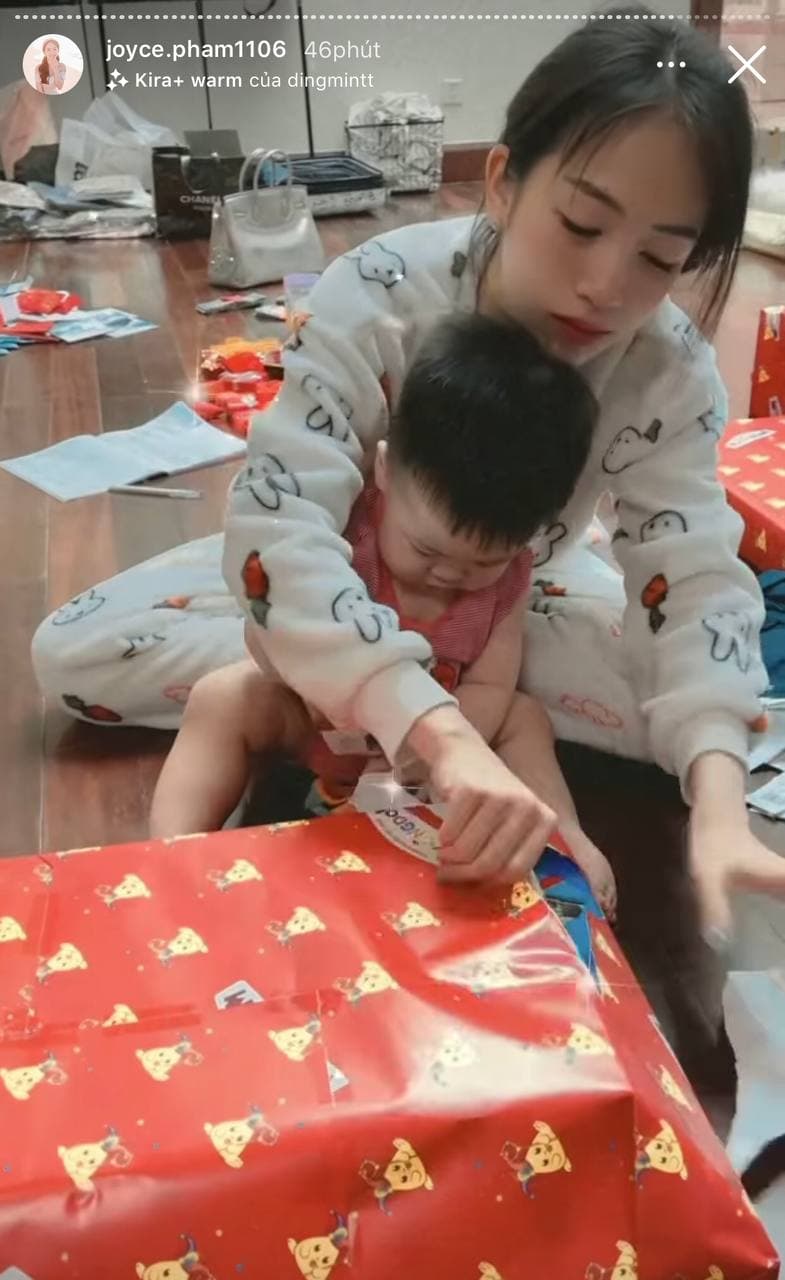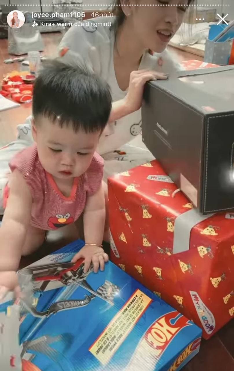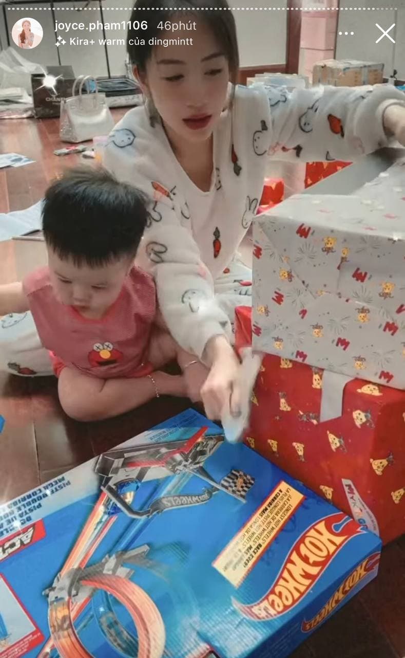 Joyce Phạm cũng chia sẻ khoảnh khắc hai mẹ con đang mở quà mừng thôi nôi. Trong số này, nhiều người chắc thắc mắc nhất là đại gia Minh Nhựa tặng gì cho cháu ngoại.