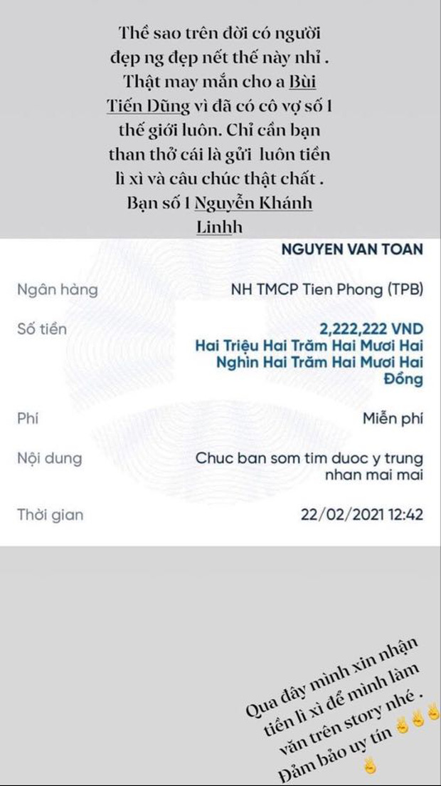 Được nhận lì xì từ Khánh Linh, Văn Toàn nhanh chóng gửi lời cảm ơn "có cánh": "Thề sao trên đời có người đẹp người đẹp nết như thế này nhỉ. Thật may mắn cho anh Bùi Tiến Dũng vì đã có cô vợ số 1 thế giới luôn. Chỉ cần bạn than thở cái là gửi luôn tiền lì xì và câu chúc thật chất. Bạn là số 1".