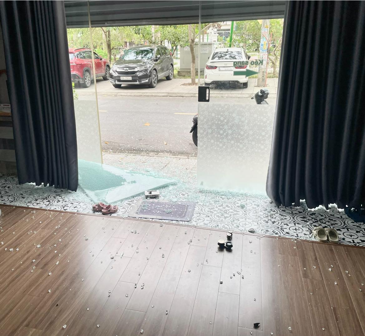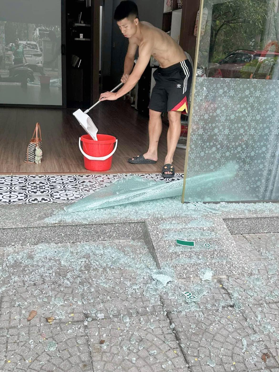 Khánh Linh cũng thông tin thêm về nguyên nhân khiến cửa kính bất ngờ vỡ: “Anh Dũng kéo cửa bị chệch ray, xong chỉnh lại rồi nó vỡ luôn”.