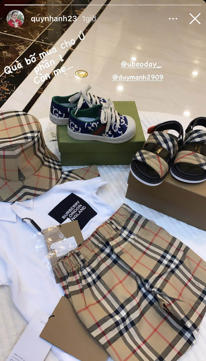 Lúc Quỳnh Anh rộ lên tin mang thai con đầu lòng, Duy Mạnh liền "tặng nóng" cho cô túi Louis Vuitton có giá khoảng 37 triệu và một đôi dép cùng thương hiệu có giá khoảng 14 triệu.