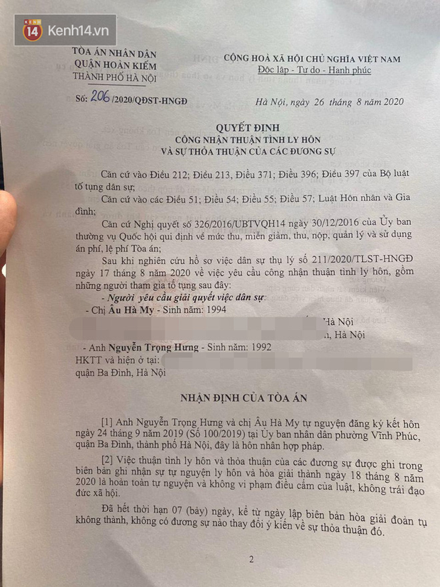 27/08/2020 04:20Vợ chồng giảng viên Âu Hà My chính thức ly hôn sau 2 tuần ồn ào