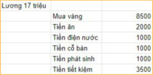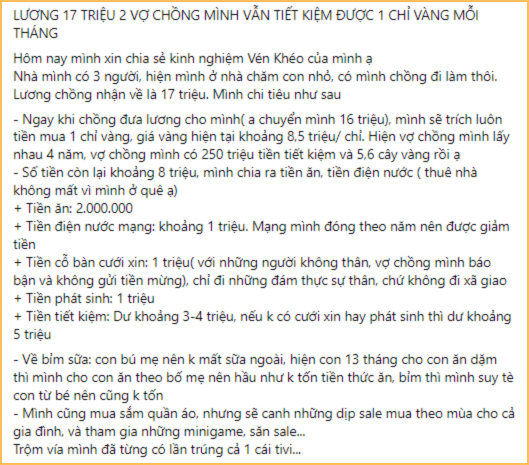Lương 17 triệu, mỗi tháng dành 8,5 triệu để mua vàng và 3,5 triệu tiết kiệm, tính ra vẫn còn dư 5 triệu - Mức ngân sách đủ cho 1 người nếu chi tiêu khéo léo. Tuy nhiên, 5 triệu với gia đình 2 người lớn, 1 trẻ nhỏ thì câu chuyện lại hoàn toàn khác.