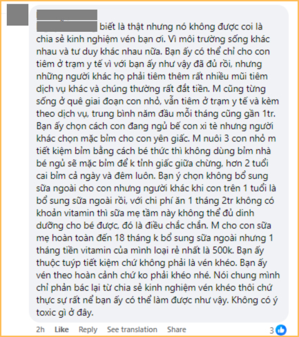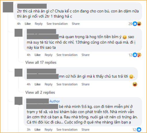 Trong phần bình luận của bài đăng, bà mẹ này cũng chia sẻ thêm rằng 2 triệu tiền ăn là đủ cho gia đình cô, con 13 tháng ăn theo bố mẹ, cả nhà vẫn ăn cơm thịt, cá đầy đủ chứ không thiếu thốn. Bên cạnh đó, bà mẹ này chỉ cho con đi tiêm miễn phí ở trạm y tế của xã, không đầu tư thêm sữa ngoài hay các loại vitamin. Nói chung với cách chi tiêu hiện tại, cả gia đình vẫn thấy ổn, vẫn sống thoải mái chứ không hề có cảm giác quá eo hẹp kinh tế.