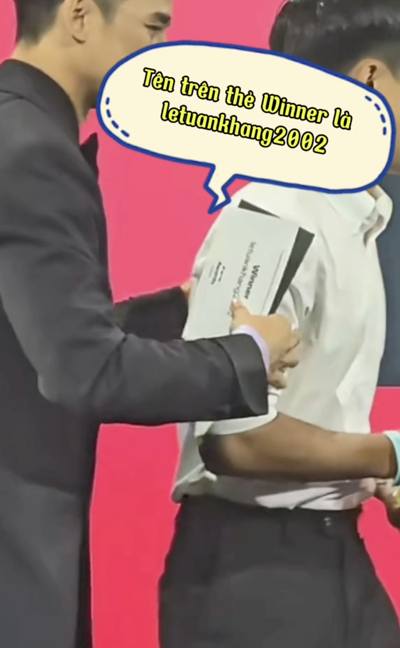 Thậm chí, netizen đã tìm ra được một video cho tấm thiệp ghi tên người chiến thắng mà Lương Thế Thành cầm ghi rõ "Winner: letuankhang2002" - ID TikTok của Lê Tuấn Khang.