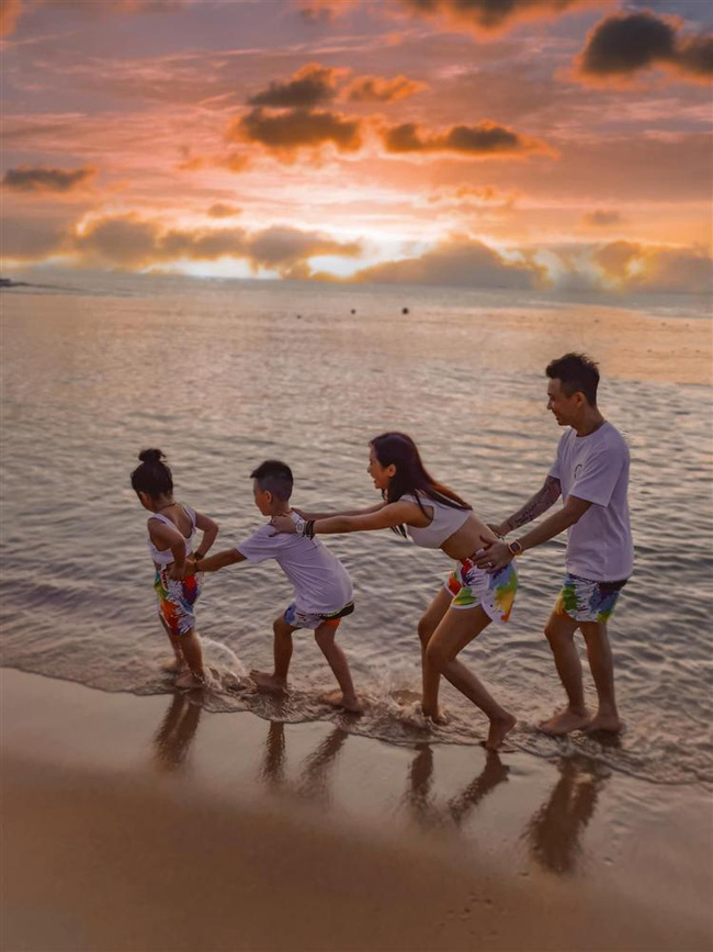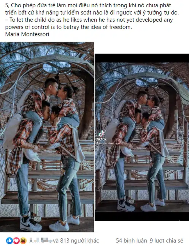 Khoảnh khắc ghi lại cho thấy cặp đôi mỗi người vác một con trên vai, và tạo dáng cực tình tứ. Trong bức ảnh, 2 bố mẹ quay mặt vào nhau cùng "khóa môi" thì các con của Minh Nhựa cũng có hành động tương tự.