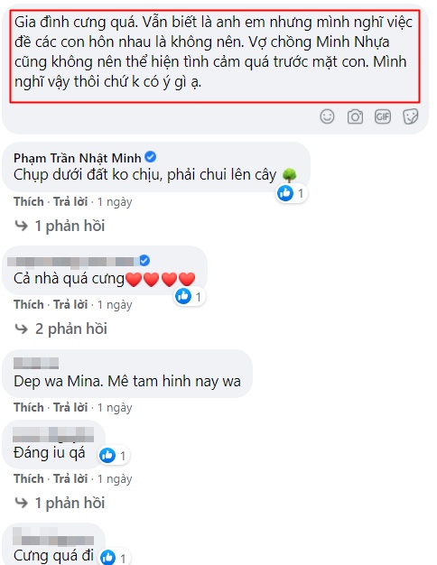 Ngay sau khi khoảnh khắc này được đăng tải, bức ảnh này của các thành viên nhà Minh Nhựa lập tức gây chú ý. Dưới bài viết, bên cạnh những bình luận khen gia đình đại gia Sài thành dễ thương và hạnh phúc là một số ý kiến cho rằng, vợ chồng Minh Nhựa không nên để các con mình "khóa môi" nhau, dù là anh em ruột đi nữa! Họ cho rằng, cặp đôi chỉ nên để các con dừng ở việc khoác vai nhau hay thơm nhẹ vào má là đủ!