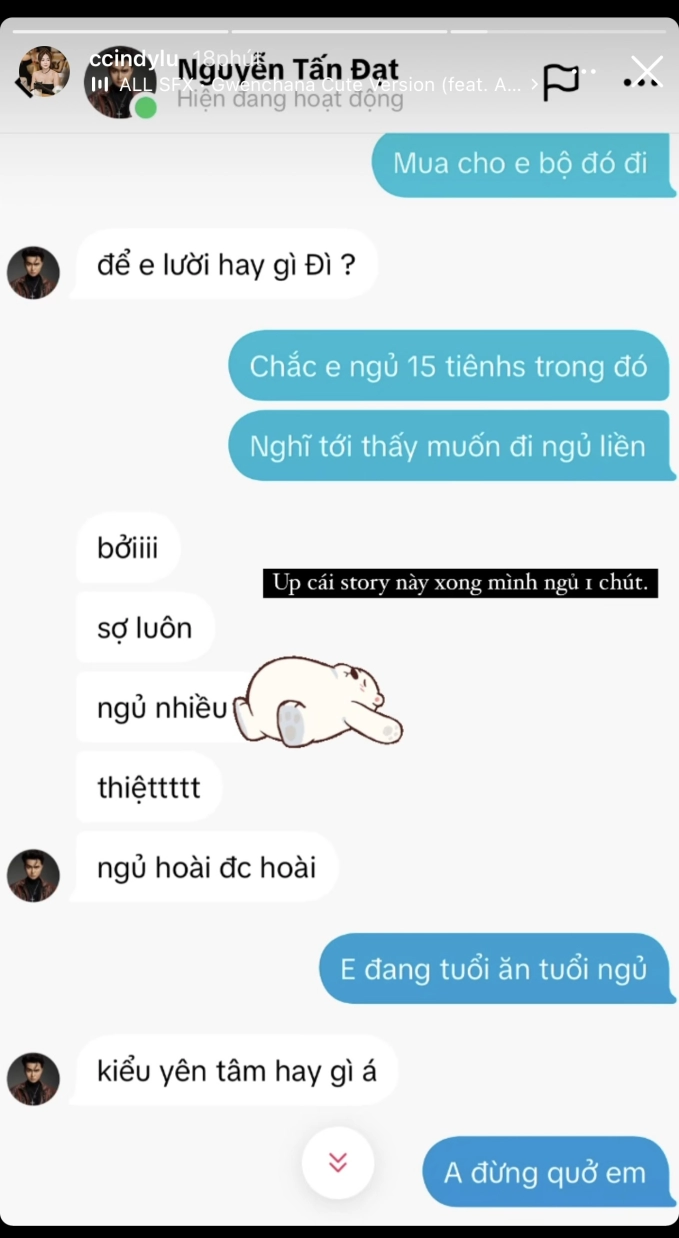 Mới đây, cô nàng không hề e ngại mà đăng hẳn đoạn tin nhắn nũng nịu với Đạt G lên mạng xã hội. Đáng nói, Đạt G cũng rất biết cách "hưởng ứng" khi cũng trêu ghẹo lại Cindy Lư. Màn đối đáp qua lại của cặp đôi khiến dân tình ngập trong tình cảm ngọt ngào.