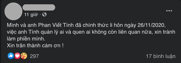 Và mới đây, thông tin ly hôn của cặp đôi đã được chị M. thông báo trên Facebook cá nhân. Theo đó, chị M. cho biết cả hai đã li hôn từ ngày 26/11 năm ngoái và hiện tại cô không còn can dự vào bất kỳ việc gì liên quan đến anh Tính sau ngày đó nữa.