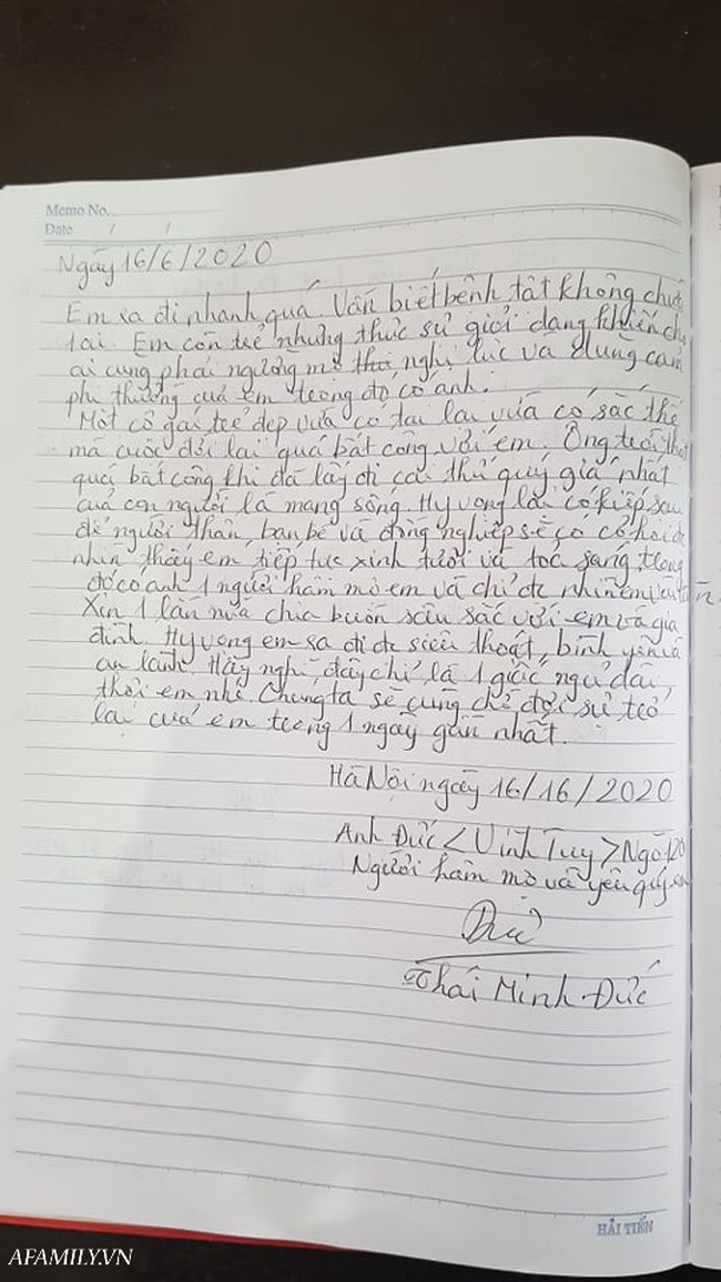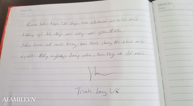 16/06/2020 20:57Vô cùng xúc động với dòng tâm sự trong cuốn sổ tang do BTV Quang Minh, BTV Long Vũ gửi gắm cho nữ MC Diệu Linh lần cuối