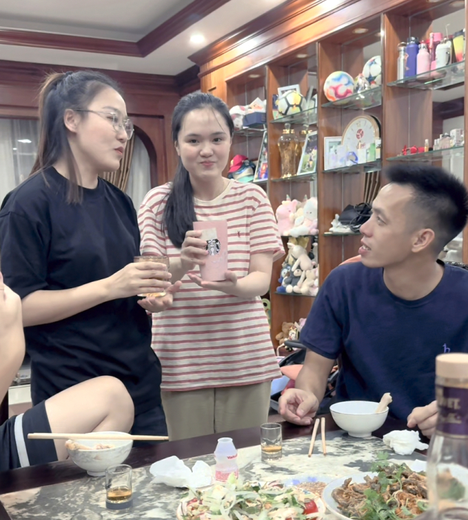 Quỳnh Anh cùng một người chị em đến mời rượu anh rể - Văn Quyết. Hai cô gái nói lời chúc mừng và lễ phép cúi người cụng ly cùng người anh của mình, và khẳng định lần nào Văn Quyết được triệu tập lên ĐT Việt Nam gia đình cũng vui như lần đầu tiên. Dù Duy Mạnh không lộ mặt nhưng dân mạng cũng dễ dàng nhận ra cánh tay của anh chàng khi ngồi cạnh Văn Quyết. Mạnh "gắt" còn góp lời kêu gọi các chị em phải uống cạn để chúc mừng.