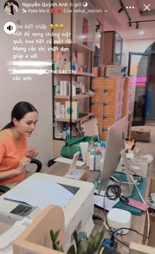 "Livestream bất chấp. Mới đẻ xong chóng mặt, hoa hết cả mặt rồi. Mong các chị chốt đơn", Quỳnh Anh chia sẻ trên trang cá nhân.