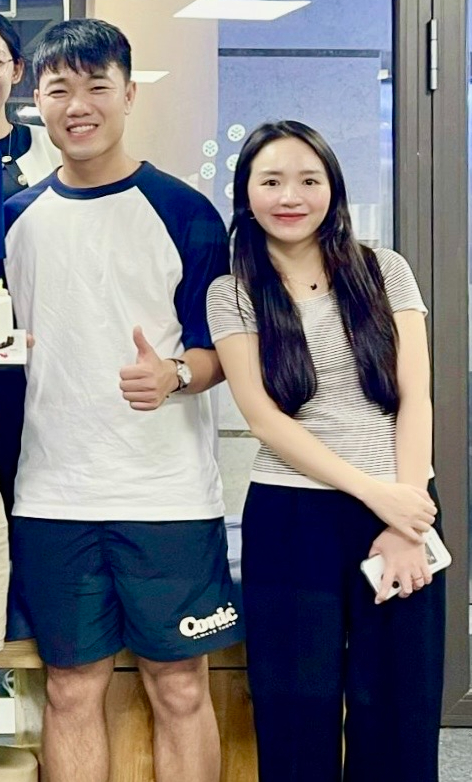 Vợ Xuân Trường diện áo phông đơn giản, gương mặt trang điểm nhẹ nhàng, moasui tóc đen dài buông xõa. Khoảnh khắc này, Nhuệ Giang xinh đẹp và gần gũi, khác hẳn vẻ tiểu thư sang chảnh trước đây. Cô nàng tạo dáng hơi nghiêng về phía Xuân Trường, còn anh chàng nở nụ cười tươi tắn.