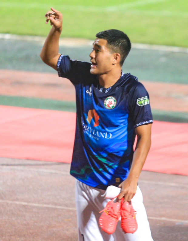 Trong khi đó ở trận đấu này Hà Đức Chinh chỉ ngồi ở ghế dự bị, CLB Bình Định cầm hoà 1-1 với đội chủ nhà CAHN. Cuối trận Đức Chinh chỉ tay hẹn đón vợ ngoài sân. Đó cũng là lý do cô nàng quê Bắc Giang đứng một mình đợi chồng ở phía ngoài.