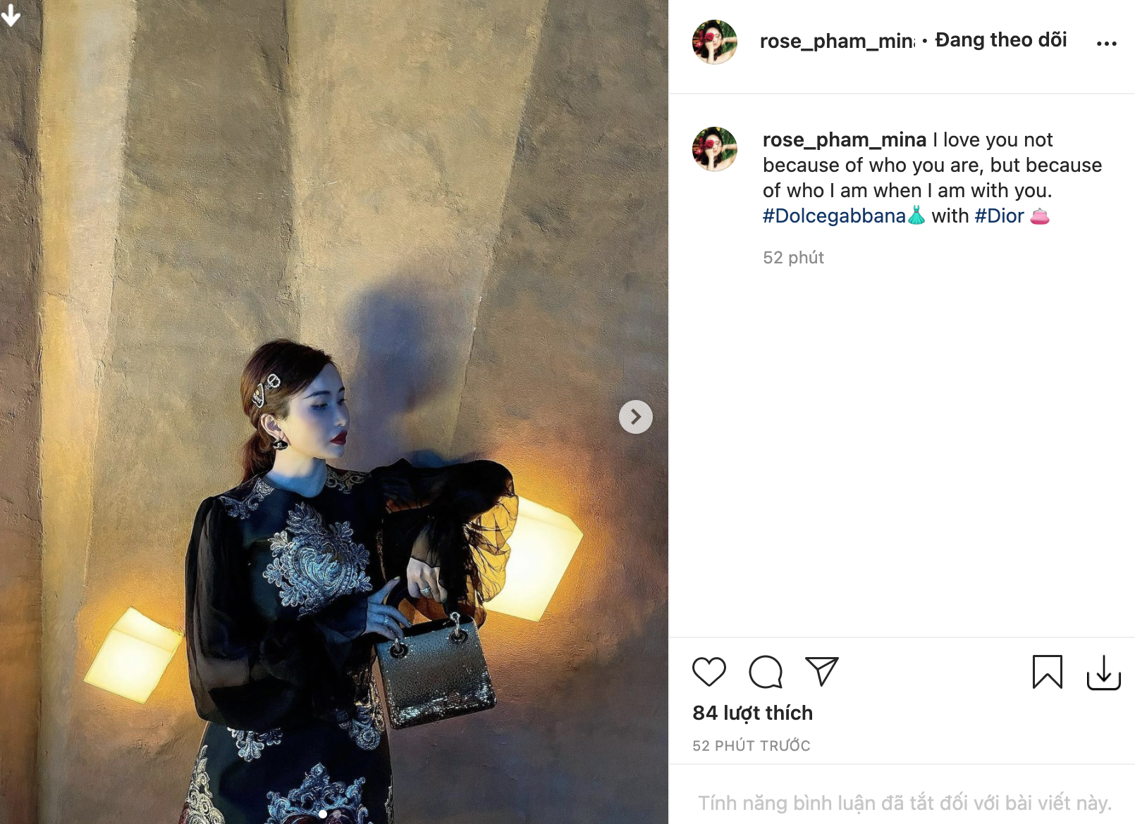 Bên cạnh thả dáng khoe chiếc túi hiệu cùng body siêu chuẩn của mình, Mina Phạm còn tìm được một câu caption khá là "sâu đíp": "I love you not because of who you are, but because of who I am when I am with you (Tạm dịch: Em yêu anh không phải vì anh là ai, mà là vì ở bên cạnh anh em được là chính mình)".