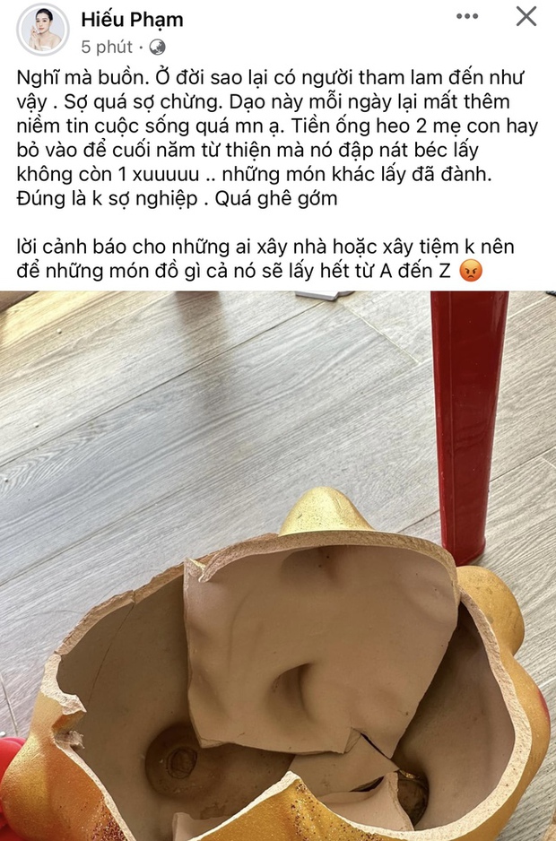 "Nghĩ mà buồn, ở đời sao có nhiều người tham lam đến như vậy. Sợ quá chừng, dạo này mỗi ngày lại mất thêm niềm tin vào cuộc sống quá mọi người ạ. Tiến ống heo hai mẹ con hay bỏ vào để cuối năm đi từ thiện mà nó đập nát lấy không còn một xu... Lời cảnh báo cho những ai xây nhà, xây tiệm là không nên để những món đồ gì cả", Phạm Hiếu chia sẻ trên trang cá nhân.