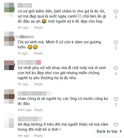 Cụ thể, một người bình luận: "Nóc nhà nhìn chán vậy". Đáp lại, Lê Anh Nuôi thẳng thắn: "Vợ tớ cao 1m60, là giáo viên thể hình, nhà mặt đường Hồ Tây tính theo trăm mét. Trước khi làm TikTok thì lương tháng của tớ chỉ bằng 10% của vợ. Vợ tớ rất yêu chồng, chăm con, theo bạn như thế có ổn không. Hình ảnh người phụ nữ đẹp nhất là khi họ chăm lo cho gia đình, phải không mọi người ơi".