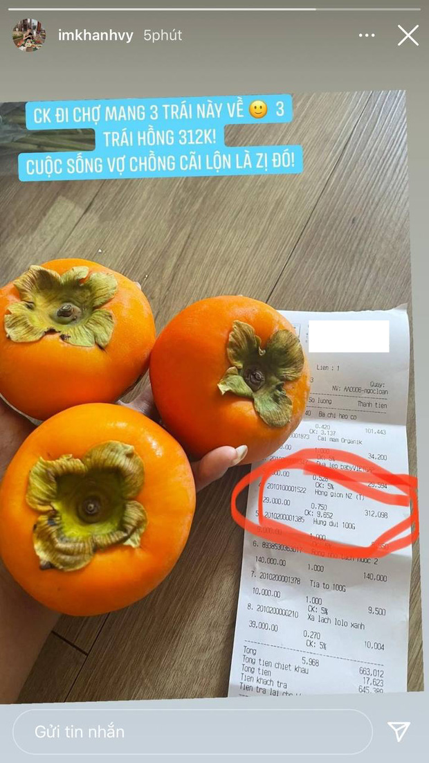 Mới đây, Khánh Vy lại được dịp kể tội chồng trên story vì lý do không tưởng: nhờ chồng đi chợ nhận lại được hóa đơn 312k cho 3 quả hồng! Giữa những món rau, củ có giá vừa phải khác, 3 quả hồng 750gr giá 312k nổi bần bật khi được Khánh Vy khoanh đỏ cho netizen nhìn rõ hơn.