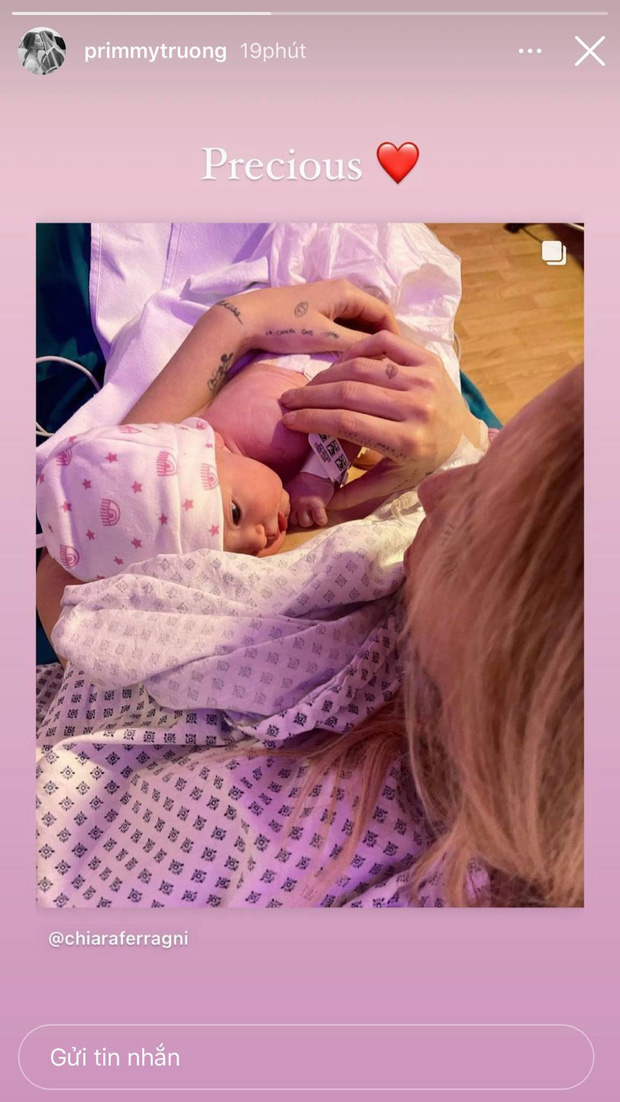 Trong một story gần đây, cô nàng lại khiến dân tình tò mò về chuyện sắp có tin vui. Theo đó, nàng dâu hào môn reup ảnh em bé sơ sinh của Chiara Ferragni - NTK thời trang đình đám. Kèm theo ảnh, Primmy Trương còn viết: "Precious" (Tạm dịch: Kì diệu) và icon trái tim đỏ chót.
