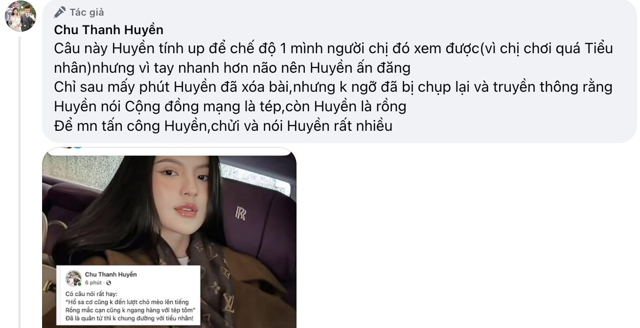 Sau khi vấp phải nhiều bình luận trái chiều, Chu Thanh Huyền sau đó đã lên tiếng giải thích về cách ám chỉ "rồng" - "tôm": "Câu này Huyền tính up để chế độ 1 mình người chị đó xem được (vì chị chơi quá tiểu nhân) nhưng vì tay nhanh hơn não nên Huyền ấn đăng. Chỉ sau mấy phút Huyền đã xóa bài, nhưng không ngờ đã bị chụp lại và truyền thông rằng Huyền nói cộng đồng mạng là tép, còn Huyền là rồng. Để mọi người tấn công Huyền, chửi và nói Huyền rất nhiều".