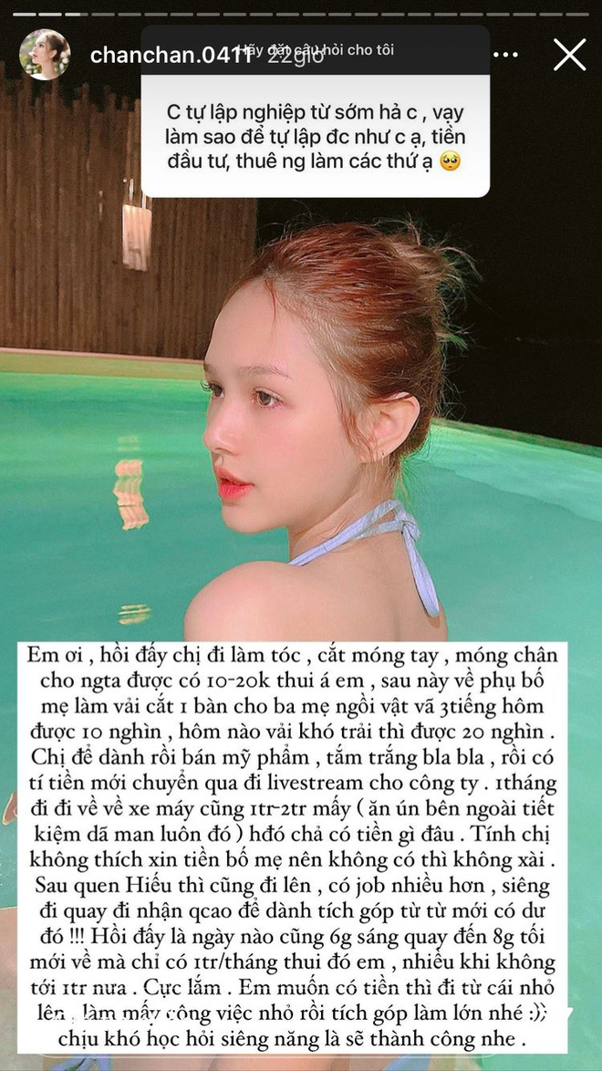 Chị để dành rồi bán mỹ phẩm, tắm trắng... rồi có tí tiền mới chuyển qua đi livestream cho công ty. 1 tháng đi đi về về xe máy cũng 1-2 triệu mấy (ăn uống bên ngoài tiết kiệm dã man luôn đó).