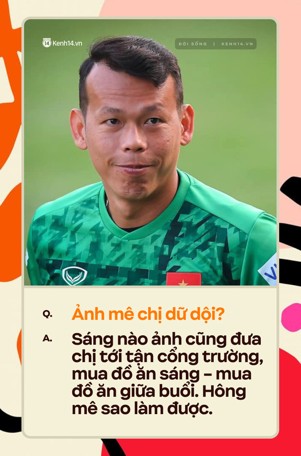 Em coi tướng ảnh to dzị đó mà ảnh gặp chị ảnh vỗ lưng chị cái bốp mà chị muốn gãy xương sống luôn. Sức cầu thủ mà em! Chị nói ảnh: Sao anh đập lưng em đau quá! Ảnh kêu đó là cách ảnh chào vợ. Chào kiểu đó với mấy anh đàn ông trong đội tuyển đá bóng thì được chứ chào chị vậy hoài chắc chị xỉu luôn đó em.