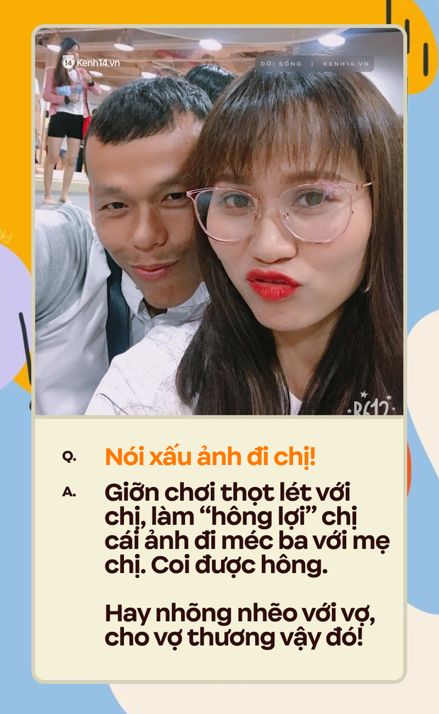(Cười) Tật xấu của ảnh là hay nhõng nhẽo khi ở nhà với chị lắm, nhất là khi ảnh muốn ăn uống hay muốn vợ làm việc gì cho, hoặc không thì cứ nhõng nhẽo cho… vợ thương thôi.