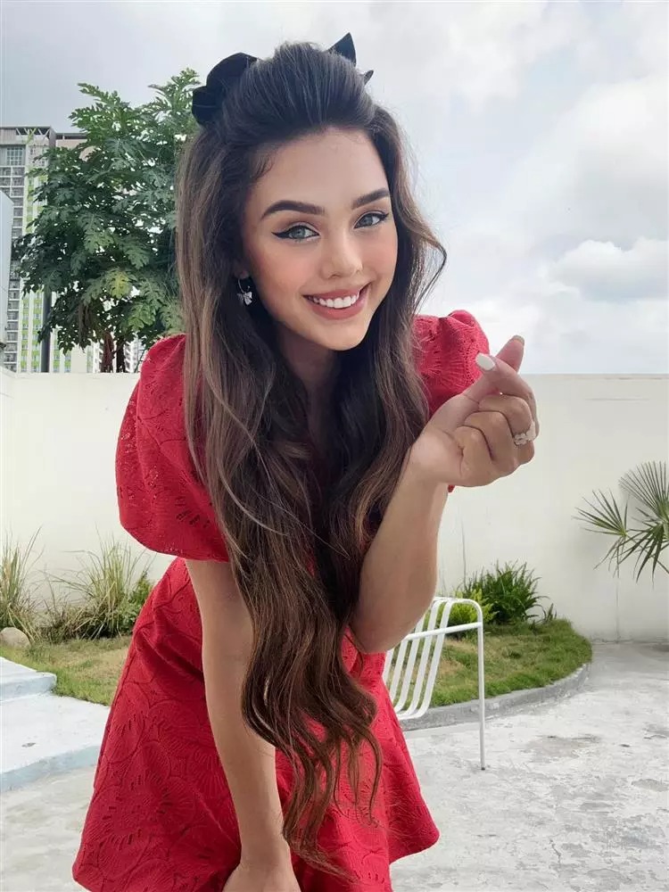 Trong hình, bà mẹ GenZ trang điểm xinh đẹp, tóc xoăn dài, nở nụ cười cực tươi hướng về phía ống kính máy ảnh.