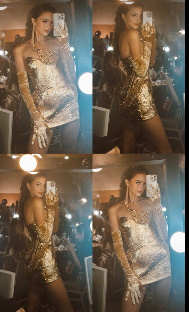 Khi trình diễn trên sàn runway, Dianka thể hiện một bộ trang phục nổi bật và quyến rũ với dáng ôm sát cơ thể, được làm từ chất liệu ánh kim lấp lánh, tạo hiệu ứng bắt sáng rực rỡ dưới ánh đèn sân khấu mang lại vẻ sang trọng và quyền lực. Thiết kế giúp tôn lên vòng eo thon gọn và đường cong cơ thể. Phần váy ngắn trên đầu gối giúp khoe đôi chân dài thẳng tắp, đồng thời tạo cảm giác trẻ trung, năng động cho nàng WAG đến từ Ukraine.