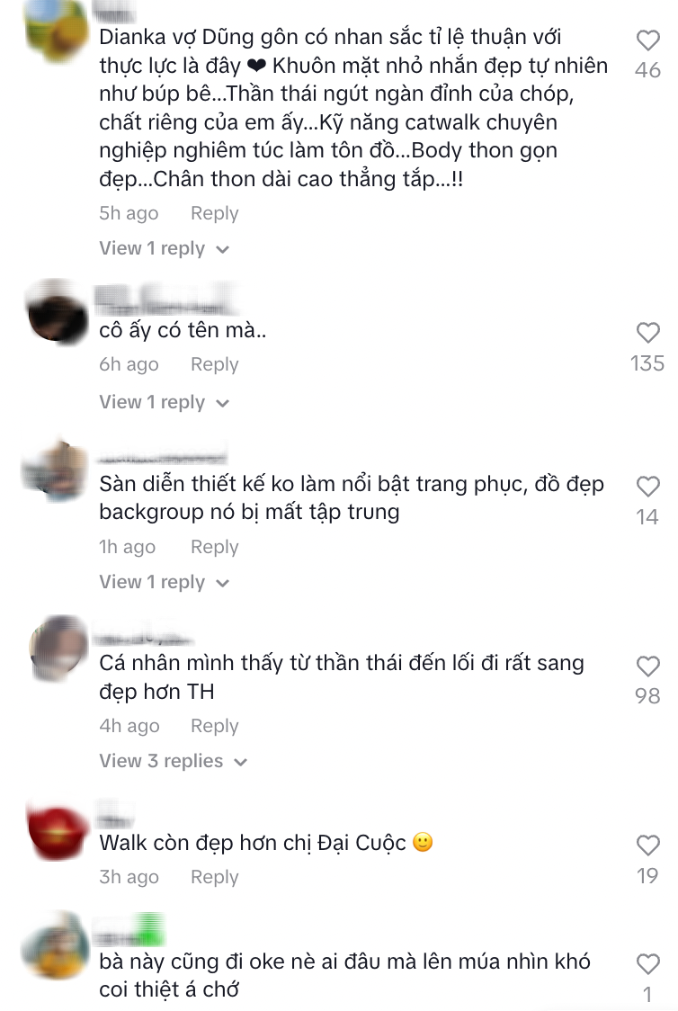 Giữa lúc một số người mẫu gây tranh cãi về phong cách trình diễn, màn trở lại sàn catwalk này của Dianka nhận về cơn mưa lời khen của cộng đồng mạng. Dân mạng bình luận rôm rả dưới video trình diễn của bà xã Bùi Tiến Dũng: "Dianka - vợ Dũng gôn có nhan sắc tỉ lệ thuận với thực lực là đây. Khuôn mặt nhỏ nhắn đẹp tự nhiên như búp bê... Thần thái ngút ngàn đỉnh của chóp, chất riêng của em ấy... Kỹ năng catwalk chuyên nghiệp nghiêm túc làm tôn đồ... Body thon gọn đẹp...Chân thon dài cao thẳng tắp", "Cá nhân mình thấy từ thần thái đến lối đi rất sang đẹp", "Bà này cũng đi oke nè, ai đâu mà lên múa nhìn khó coi thiệt á chớ", "Mẫu Tây người ta walk bình thường thôi cũng đủ sang và tôn đồ", "Cái cặp giò đỉnh. Thích dáng chân kiểu này", Bạn này diễn đỉnh quá", "Sang xịn mịn"...