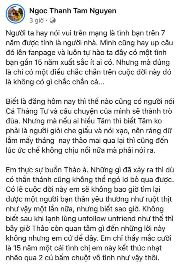 Một trong những chuyện Cá tháng Tư nhạt nhất năm 2021 này có lẽ chính là màn giả bộ nghỉ chơi của Primmy Trương và Ngọc Thanh Tâm khi cả 2 cô nàng đều thi nhau đăng những bức ảnh hoặc câu quote lên story ngầm ý tình bạn tan vỡ.