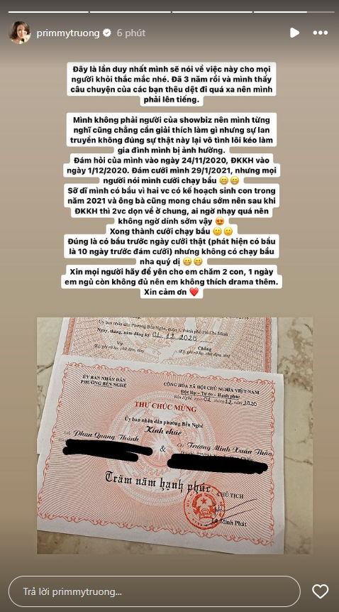 Đúng là có bầu trước ngày cưới thật (phát hiện có bầu là 10 ngày trước đám cưới) nhưng không có chạy bầu nha quý vị" - Primmy Trương nói.