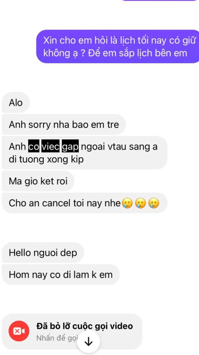 Sau đó vài tháng, khi K. vừa chia tay người yêu cũng cũng là lúc V. về nước chơi. Chàng trai đã ngỏ lời mời K. đi ăn vì trước đó cả hai cũng đã bắt đầu trò chuyện đều đặn hơn ở trên MXH. Cũng vì mong muốn mở rộng mối quan hệ, K. đồng ý hẹn gặp nhưng ngay lần đầu tiên, cô nàng đã bị cho “leo cây” với lý do: “Có việc gấp ngoài Vũng Tàu, sáng anh đi tưởng xong kịp mà giờ kẹt rồi” .