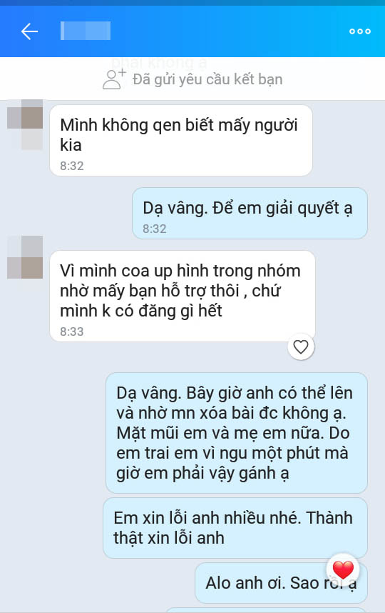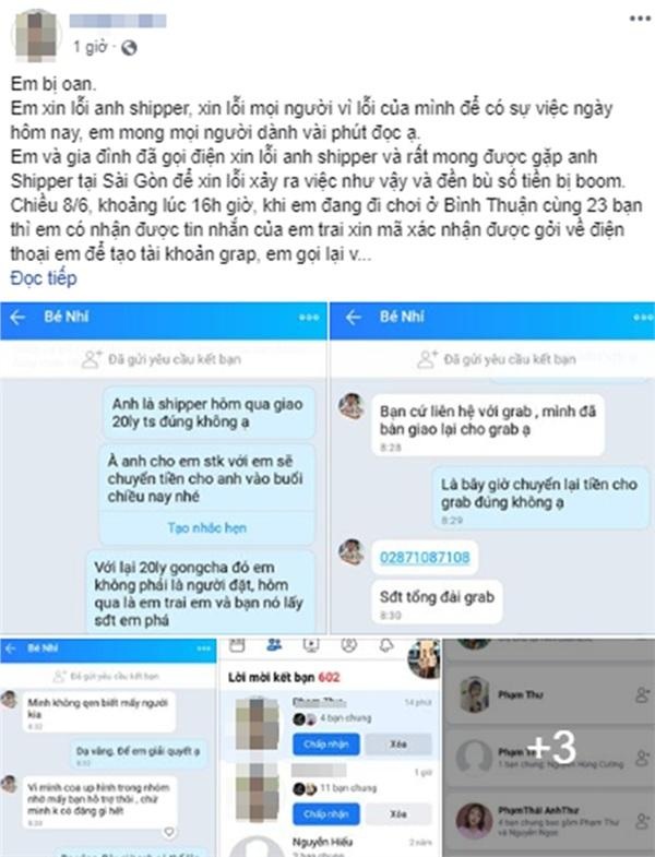 Tôi không biết phải bạn hay em bạn nhưng bạn nói xin lỗi và nói liên hệ với công ty tôi để đền bù lại số tiền, nhưng đến ngày hôm nay, tôi không thấy tin tức bạn hối lỗi hay bạn thay mặt em bạn xin lỗi. Đền trả mà tôi lại thấy bạn đưa tin nhắn tôi trao đổi để giúp bạn lên facebook.