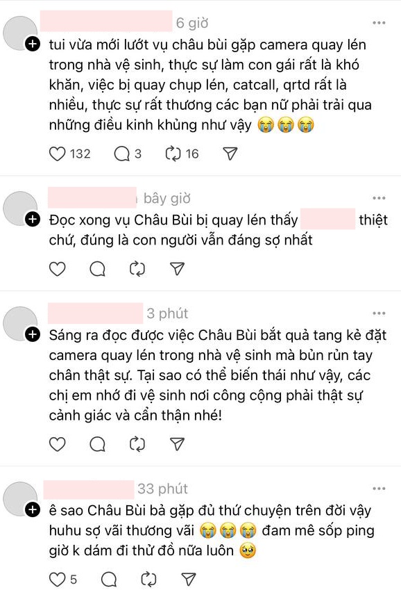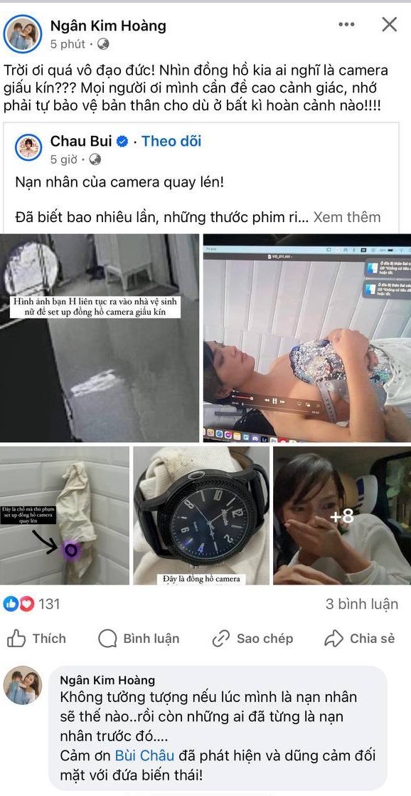 Vân Hary - một người mẫu ảnh tự do còn bày tỏ: "Từng là nạn nhân nên thật sự cũng rất đồng cảm với chị Châu… thật sự giờ mấy cái camera khó phát hiện lắm không phải có app mà dò ra được đâu".