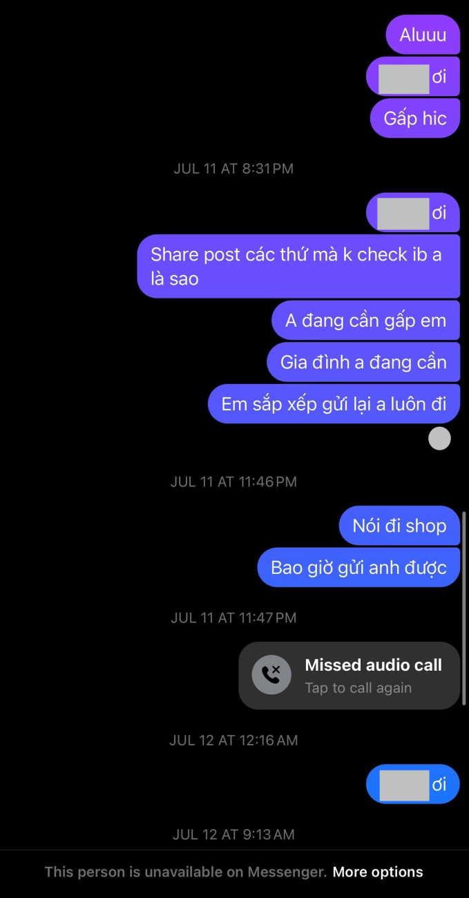 - Bạn nữ này kiểu cũng được người khác chiều chuộng, gặp bạn này có 1,5 triệu mà cũng đòi nên đâm ra không thích trả lời nữa rồi block luôn chứ không lừa gì.